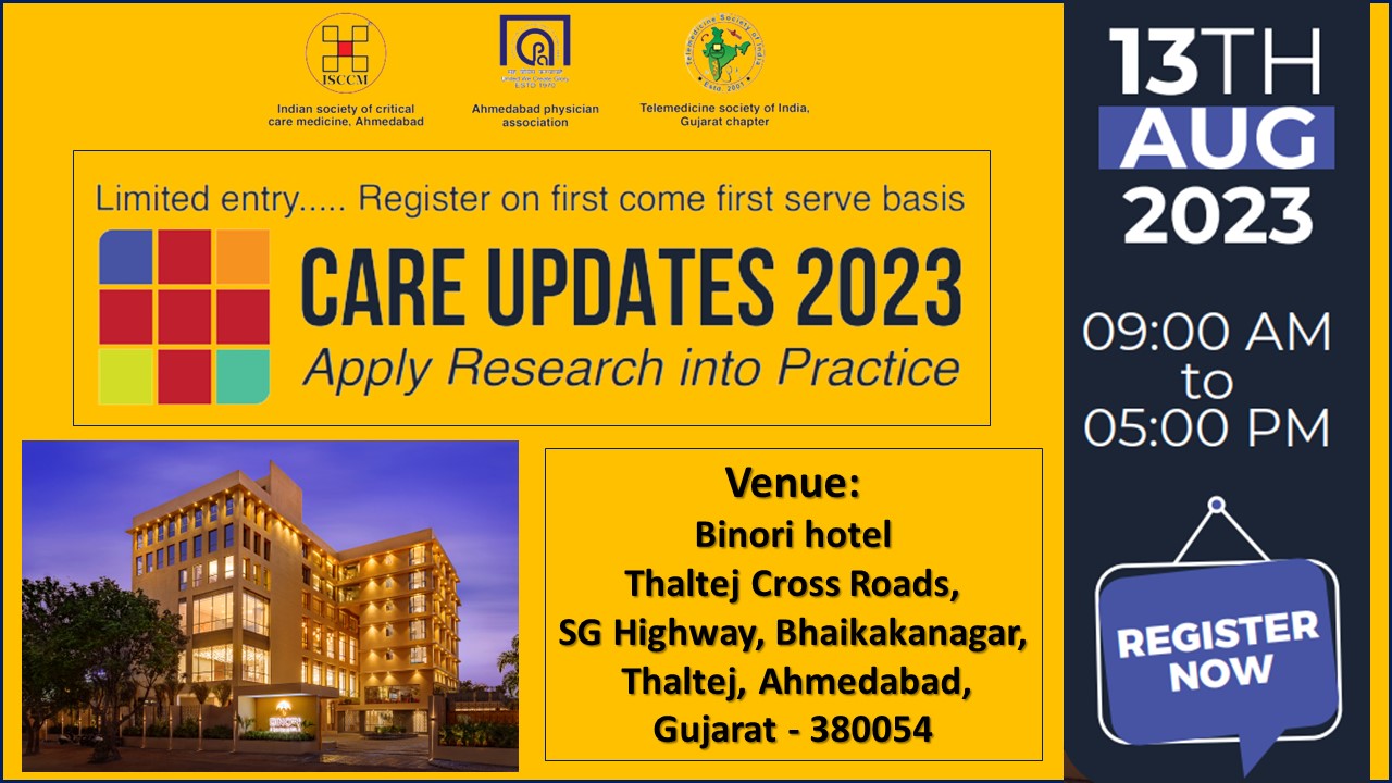 Care Updates 2023: Applying Research into Practice is an event organized by Dr. Raj Rawal (MD IFCCM), the organizing chairman, and Dr. Divyang Dalwadi (MD iDCCM), the organizing secretary. The event is in association with the Indian Society of Critical Care Medicine, Ahmedabad, the Telemedicine Society of India, Gujarat Chapter, Ahmedabad Physician Association. It will take place on Sunday, August 13th, 2023, at 9:00 AM at the Binori Hotel, Thaltej Cross Roads, SG Highway, Bhaikakanagar, Thaltej, Ahmedabad. Registration will be on a first-come, first-served basis.