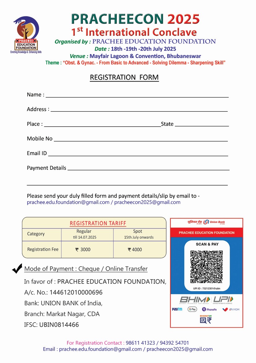 In quest of enhancing skill and knowledge among the Obstetricians and Gynaecologists, Prachee Education Foundation always looks forward to new ventures. In this context, Prachee Education Foundation is going to organize a three-day International Conclave with the theme "Obst.& Gynaec. - From Basic to Advanced - Solving Dilemma - Sharpening Skill" on 18th, 19th & 20th July 2025 at Hotel Mayfair Lagoon I Convention, Bhubaneswar, to fulfill the long-cherished desire.